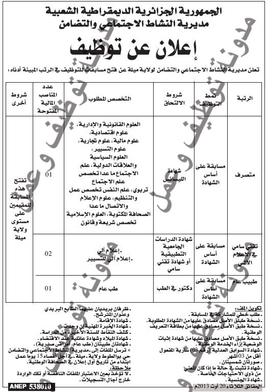 مديرية النشاط الاجتماعي لولاية ميلة توظف