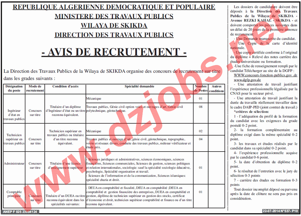 مسابقة توظيف بمديرية الأشغال العمومية لولاية سكيكدة جويلية 2014 |