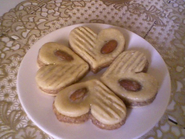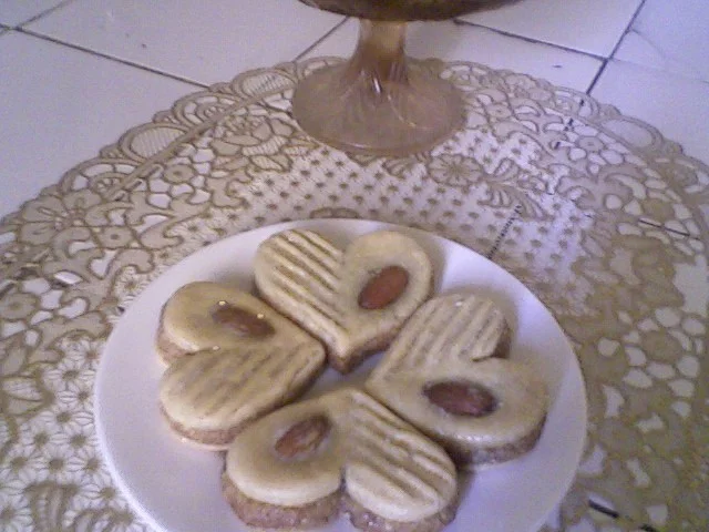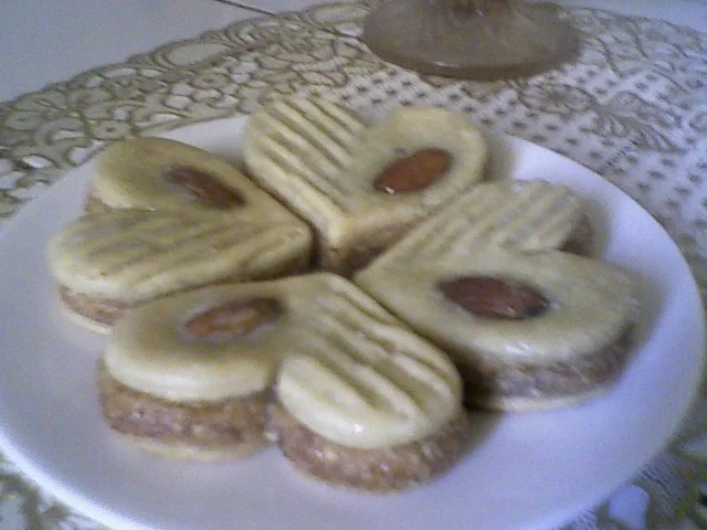 المقـآدير : 500غ كوكآو أو لوز مرحي رقيق 300غ سكر قلآصي 1 م ص فآنيليآ قشور ليمون بيض حسب الحآجة أنآ استعملت 2 للتغليف : قلآصآج طريقة التحضير : يطحن الكوكآو في خلآط ميكسر مع السكر ثم يوضع الخليط في وعآء وتضآف له الفآنيليآ وقشور الليمون والبيض حسب الحآجة حتى تتحصلي على عجينة متمآسكة تفرد العجينة وتطبع بأي طآبع أنآ اسعملت طآبع مدور ![]() يوضع في الصينينة ![]() ويدخل للفرن لمدة خمس دقآئق ![]() وبعد ذلكـ يجهز القلآصآج وحين يبرد يزين حسب الرغبة ![]() مقادير: 500غ كوكاو 500غ سكر قلاسي 500غ فرينة 1 خمارة ونصف 1 ملعقة صغيرة قرفة زيت لجمع العجينة سكر حرش التحضير: اولا نشرح البراليني هوعجين يصنع من اللوز والسكر يعني نفس كمية السكر تكون نفس كمية اللوز اللوز يكون بقشوره تحمصيه وهو سخون تطحنيه مع السكر حتى يصبح مثل العجين لازم يكون سخون ويدخل في تحضير العديد من الحلويات والتورتات والكريمات. انا اليوم جبتلكم غريبية بالبراليني تاع الكوكاو وتجي رائعة في الذوق. نحمص الكوكاو حتى يحمر قليلا وهو سخون نرحيه في الروبو مع السكر قلاسي حتى يصبح كالعجينة ![]() ثم نضيف في الصحن ![]() ثم نضيف له الفرينة والخمارة والقرفة ونخلط حتى يدخل خليط الكوكاو في الفرينة مبعد نبدا نزيد الزيت تدريجيا ونعجن حتى تتلم العجينة وتصبح متماسكة ![]() نشكل كويرات نرمدهم في السكر الاحرش ![]() ثم ندخلهم للكوشة يطيبوا في فرن 180 درجة لمدة20د حتى تشوفي الحلوى تتشقق وهذا شكلها لما تطيب. ![]() ![]() المقـآدير : 4 بيض 200غ سكر قشور حبة ليمون 40غ زبدة ذآئبة 4 م ك حليب 300غ فرينة 1 كيس خميرة كيميآئية طريقة التحضير : أولآ تجهز قوآلب المآدلين يدهنهآ بالزبدة الذآئبة ورشهآ بالفرينة ![]() بعد ذلكـ في وعـآء وبخلآط كربآئي يخفق البيض مع السكر جيدآ ثم تضآف قشور الليمون والزبدة الذآئبة والحليب ويخلط الكل ثم أخيرآ تضآف الفرينة والخمـآرة ويخلط حتى نتحصل على خليط كهذآ ![]() يسكب الخليط في القوآلب ![]() ويدخل للفرن المسخن 180° حتى يطهى تملأ الفرآغآت بالمربى وتقدم ![]() المكونات 500غ لوز مرحي رقيق 250غ سكر رطب فاني 3بياض بيض التحضير اللوز +السكر +فاني نلم العجينة ببياض البيض حتى نتحصل على عجينة شادة روحها نقسم العجينة على 2 او اكتر كيما نحب ونلون كل جزء باللون والنكهة المناسبة نشكل الكويرات نلرمدهم في سكر رطب ونرشقهم بانصاص حبات اللوز او البيستاش للعجينة الخضرا ونحطهم في سينية مرشوشة بالفرينة ندخلهم يطيبو في فرن 180°حتى يحمارو من التحت واترككم مع الصور المكونات قاطو بيمو حليب محلى ومكثف نستلي حفنة مكسرات جوز ولوز شيكولة نوار الطريقة نفتت حبات البيمو ونحطها في الميكسور مع الجوز واللوز ونرحيهم ![]() ثم نضيف النستلي ونخلط ![]() ثم نشكلها كويرات وداخل كل كويرة نضع نصف جوزة ![]() نذوب الشيكولة في حمام مائي ونضيفلها ملعقة صغيرة زبدة نغطس الكويرات في الشيكولة الدائبة ونضعها في صحن مغلف ببلاستيك حتى يسهل نزعها فيما بعد ![]() ندخلها للثلاجة حتى تجمد الشيكولة ثم نخرجها ونزينها بملأ la seringue بالشيكولة الذائبة ونتركها تبرد مرة ثانية ثم تقدم في اكياس ورقية ![]() ![]() لمقادير: ![]() 250غ صمعة(سمن) نصف كأس سكر ارطب بيضة وصفار نصف كيس خميرة ملعقة اكل معجون المشمش ملعقة اكل جنجلانية مرحية ونشيح بلفرينة التزين: ![]() بياض بيضة عصير حبة قارص 3ملاعق اكل ماء الزهر وسكر نونورس معجون +عجينة اللوز طريقة التحضير : ![]() نجمع السمن مع باقي المكونات ونشيح بلفرينة نطرحه وطبعه على شكل قلب نطهيه في فرن معتدل ولما هو ينضج نحضر قلاصاج روايال: نخلط بليد بياض البيض مع عصير القارص والماء الزهر ثم نعجنه بسكر نونورس ولما يصبح عجينة متماسكة نطرحها تكون رقيقة ونطبعها بنفس القلب الذي طبعنا به الحلوى لما تنضج الحلوى ندهنها بالمعجون ونضع فوقها الالقلب المصنوع من القلاصاج ونضع في نصفه نواد كوكو وفي النصف الاخر وردة من عجينة اللوز لحوالي 22حبة مادلين كبار في الميكسور او الباتور نحط 3 بيض +كاس سكر+3/4كاس زيت +كاس حليب +2ليفور خميرة كيميائيةفاني +قشور قارص او برت