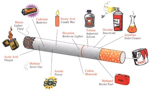 ما هي المكونات الضارة في السجائر؟ تأتي على رأسها عشرة مواد هي الأكثر خطورة على الإطلاق. (1) الأمونيا: تستخدم لزيادة معدل امتصاص النيكوتين. (2) الزرنيخ: يستخدم الزرنيخ كمبيد للآفات والحشرات في نباتات التبغ، وفي قتل الفئران في المزارع والبيوت، وتبقى آثار الزرنيخ في التبغ عند تصنيع السجائر. (3) الكادميوم: مركب معدني يتكون داخل التبغ المزروع في التربة الحامضية، وهو المركب الذي يستخدم في صناعة البطاريات القابلة لإعادة الشحن. (4) الفورمالدهايد: منتج ثانوي داخل دخان احتراق السجائر، وهو غاز عديم اللون يستخدم في حفظ جثث الموتى. (5) أسيتون: منتج ثانوي داخل دخان احتراق السجائر، وهي مادة قوية تستخدم في إزالة طلاء الأظافر، وفي تنظيف المراحيض. (6) البوتان: مادة كيميائية خفيفة تضاف إلى السجائر لجعلها سهلة الإشعال. (7) بروبيلين جليكول: مادة كيميائية تضاف إلى السجائر لحفظ التبغ من الجفاف. (8) زيت التربنتين: يضاف إلى السجائر ذات نكهة المنتول (النعناع)، وهو زيت يستخدم في الرسم والطلاء. (9) البنزين: منتج ثانوي داخل دخان احتراق السجائر، ويوجد في المبيدات الحشرية وفي وقود الجازولين. (10) معادن الرصاص والنيكل الضارة.