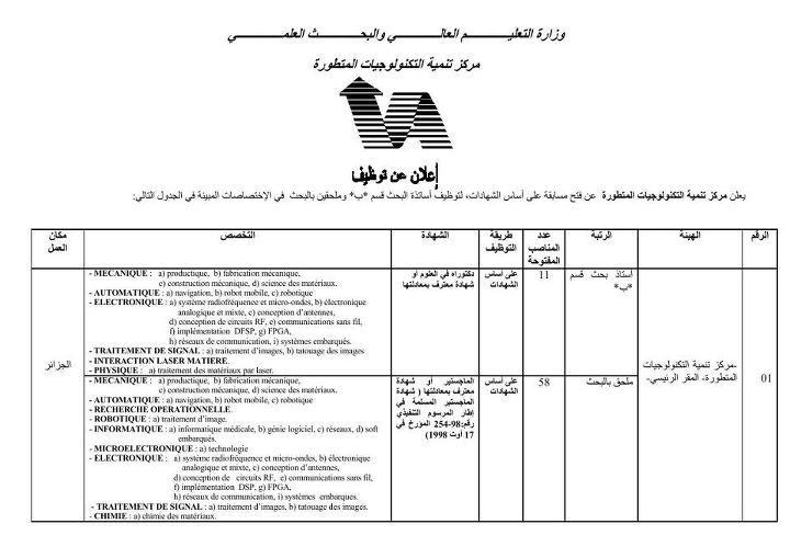 ÅÚáÇä ãÓÇÈÞÉ ÊæÙíÝ ÊæÙíÝ Ýí ãÑßÒ ÊäãíÉ ÇáÊßäæáæÌíÇÊ ÇáãÊÞÏãÉ ÇáÌÒÇÆÑ ææáÇíÉ ÓØíÝ ÇßËÑ ãä 120 ãäÕÈÇáãäÇÕÈ Ýí ÇáÌÒÇÆÑ - 85 ãäÕÈ ¡ ÇáãäÇÕÈ Ýí ÓØíÝ - 36 ãäÕÈ . |