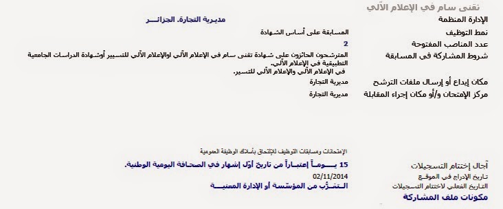 اعلان توظيف مديرية الصجة والسكان - بشار -نوفمبر2014 |