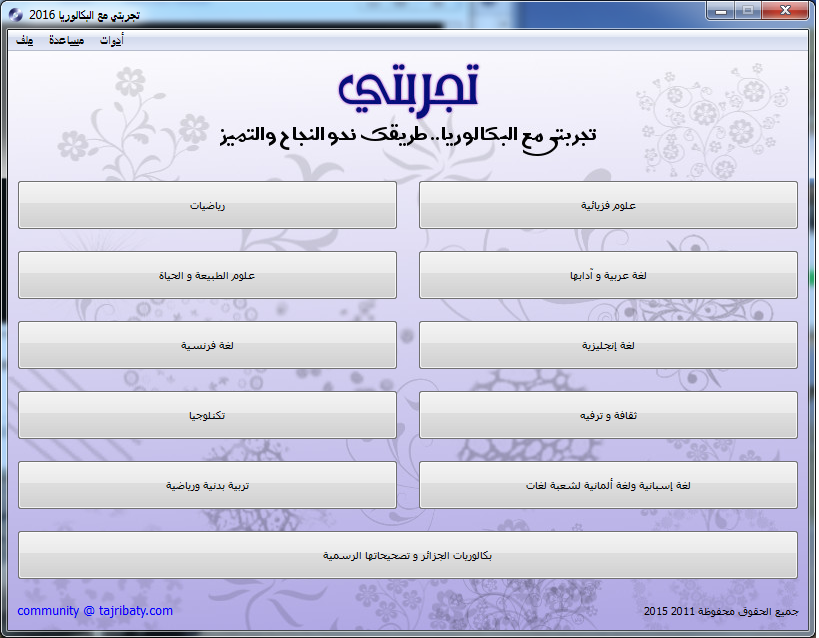 بسم الله الرحمن الرحيم أهلا بجميع أساتذة التعليم الثانوي، أهلابجميع التلاميذ المقبلين على امتحان شهادة التعليم الثانوي اقدم لكم قرص تجربتي مع البكالوريابإصداره السادس-2016-،قرص تجربتي مع البكالوريا يحتوي على كتب و ملفات تعليمية مرتبة و منظمة بحيث يسهل الاطلاع عليها و مراجعتها، و هو يحتوي على الكثير من التمارين المحلولة و المقترحة لامتحان شهادة البكالوريا، ويضممواضيع البكالوريا الجزائرية منذ 2008 مع التصحيح النموذجي و بعض مواضيع البكالوريا الأجنبية المترجمة و مواضيع الدول الشقيقة كتونس و المغرب؛ ................................... كما يمكن للتلاميذ طرح أسئلتهم حول الدروس والتمارين وستجدون الإجابة من الأعضاء إن شاء الله روابط التحميل: رابط الجزء الخامس
