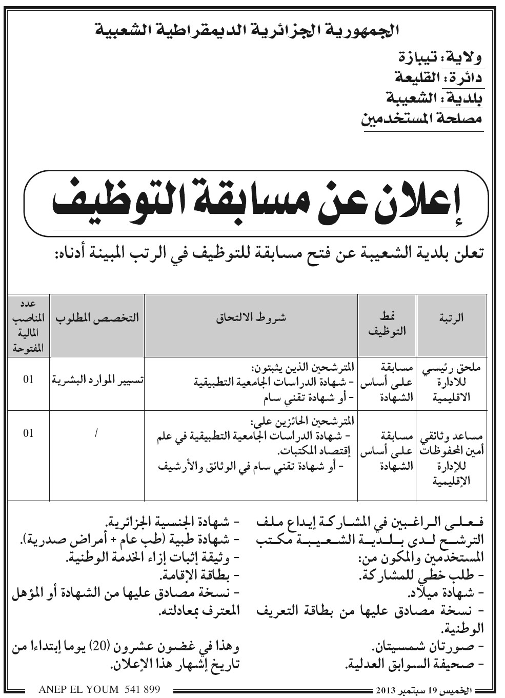 مسابقة توظيف ببلدية الشعيبة ولاية تيبازة سبتمبر 2013 مسابقة توظيف ببلدية الشعيبة ولاية تيبازة سبتمبر 2013 مسابقة توظيف ببلدية الشعيبة ولاية تيبازة سبتمبر 2013