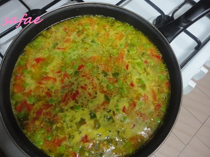 يقلى البصل و الفلفل في الزيت جيدا مع الثوم نضيف الجلبانة و الروز و ننتظر قليلا حتى يشرب الروز ماء الخضر