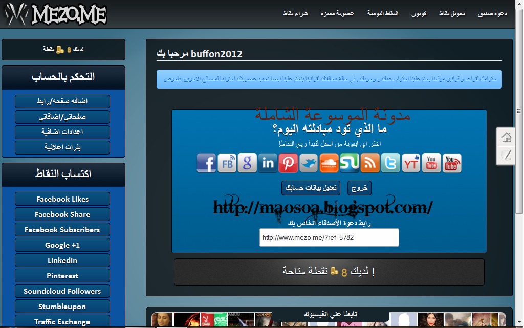 انا جبت ليكى شرح اهم و اشهر موقع و فى ثوانى النقاط بتتحول لليكات و ممكن فى اليوم الف لايك حسب مجهودك و الموضوع دا من مجهودى الشخصى اكسب الالاف الاعجابات والتغريدGoogle +1 واشتراكات اليو تيوب والمزيد شرح شامل كامل بالصور والفيديو ملاحظه هامة : هذا الموقع مبني على اساس اعجابات حقيقية مشاهدات حقيقية وليس ( بوتس او زوار وهميين) من فتره وجيزة اشتهرت المواقع التي تقدم خدمات النقاط وبعض هذه الخدمات ******** Likes Google Circles Google +1 Twitter Followers YouTube Views YouTube Subscribe واليوم الموقع الذي ساشرحه موقع شامل واهم خدمه يقدمهاالالاف المعجبين العرب بصفحتك على حسب عدد النقاط التي تكسبها بسم الله نبدا اول حاجه هتروحوا على اللينك هنا ونقوم بعملية التسجيل الخطوه الاولى اضغط على تسجيل عضو جديد واكتب المطلوب منك ![]() طبعا عند التسجيل تحصل على50 نقطه مجانا وكل 24 ساعه تحصل على 50 نقطه مجانا عن طريق الخيار النقاط اليومية بعد اتباع طريقه التسجيل السهلة يتم توجيهك الى الموقع نجدا الخيارات التالية لاضافه موقعك لتحصل على زوار او صفحتك على الفيس بوك لتحصل على اعجابات او تويتر لتحصل على متابعين او يوتيوب لتحصل على مشاهدين كل هذا واكثر اضغط على اضافه صفحه/رابط اختر كما بالصوره انا مثلا اخترت اضافة بيجى/صفحتى المتواضع لاكتساب النقاط تستطيع من خلال الخدمات فيس بوك تويتر وغيرها والافضل بينها الفيس بوك لانه الاغلب مسجل فيه احنا هنختار الفيس بوك وهيجبلك كدة هيطلع صفحة بالشكل ده تم الانتهاء من الشرح بالصور تحياتى