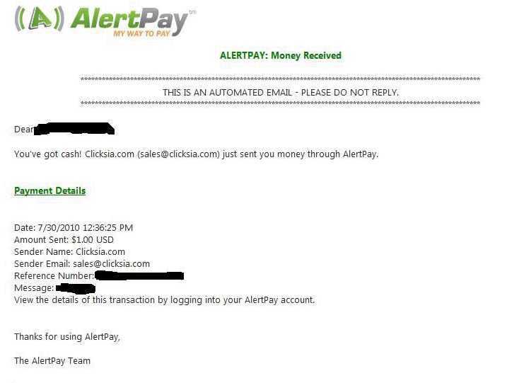 شركة Clicksia.com هي من الشركات ذات ثقة ومصداقية كبيرة على الأنترنت فالشركة في الاصل قائمة على العروض لكن فيها اعلانات كثيرة ممكن تكسب 4 سنت من الضغط على الاعلانات يوميا اما العروض ما بين 10الى 20 سنت والحد الادنى دولار واحد تقدر تعمله بسهولة ومدة الدفع من 1-7ايام لكن على الأغلب تدفع في اليوم التالي . وهذا إثبات دفع من الشركة على بنك payza [ alertpayسابقا ] : 1- مميزات الشركة : 1- من 8-12 اعلان يوميا . 2- عروض كثيرة مابين 10- 20 سنت. 3- تقبل Payzaو paypal. 4- حد ادنى 1 دولار والدفع كما ذكرت شبه فوري. 2- طرق الربح من الشركة : يوجد في الشركة 4 طرق للربح منها وسوف أذكرها في مايلي : الطريقة الاولى : وهى عن طريق الضغط على الاعلانات وتربح من 0.001 الى 0.002 سنت عن كل اعلان ومدة الانتظار تتراوح من 10 الى 50 ثانيه وعدد الاعلانات 44 اعلان يوميا . الطريقة الثانيه : وهى عن طريق التسجيلفى المواقعوتربح من التسجيل من 10 إلى 20 سنت . الطريقة الثالثة : وهى عن طريق زيارة المواقع وكتابة فكرتك عن كل موقع قمت بزيارته وهي طريقة مربحة جيداااا . الطريقة الرابعة : وهى خاصه باصحاب المواقع وهي أيضا مربحة لمن يمتلك موقع على الأنترنت أو مدونة . . . طريقة أخرى للربح من الشركة : وهي عن طريق دعوة أصدقائك للتسجيل عن طريق رابط الدعوة الخاص بك فتربح عن كل شخص 10 % من أرباحه في الشركة . ملاحظة مهمة حول الشركة : الحد الادنى لسحب ارباحك هو 1دولار على بنوك Payza و Paypal ويتم الدفع فى خلال 7 ايام لكن الشركة تدفع في يوم واحد و7 أيام هي اقصى حد لإنتظار الدفع 3- طريقة التسجيل في الشركة : أولا نضغط على الرابط التالي : ثم نتابع الشرح بالصور : والآن بعدما قمنا بالتسجيل في الموقع راح نذهب إلى البريد الإلكتروني الذي سجلنا به في الشركة وراح نلاقي رسالة لتأكيد الإشتراك في الشركة نفتحها ونضغط على رابط تأكيد التسجيل لاحظ الصورة التالية : وهكذا نكون قم إنتهينا من شرح التسجيل في الموقع وتأكيد الإشتراك الآن نسجل الدخول إلى الشركة لاحظ الصور : راح تظهر هذه الصورة بعد تسجيل الدخول في الشركة تبين شرح شامل للشركة وطرق الربح منها وكيفية تغير بياناتك الشخصية وتسجيل الخروج من الشركة : الآن راح نشرح كيفية الضغط على الإعلانات في الشركة تابع معي الصور : ونعيد التجربة على كل الإعلانات يوميا ... الآن نشرح طريقة الربح من العروض تابع معي الصور : بعد الضغط على رابط الموقع راح نقوم بالتسجيل في الموقع ثم يرسل الموقع الذي سجلنا به رسالة إلى البريد الإلكتروني المسجل به في الموقع إنسخ محتوى الرسالة بدون جزء الباس واليورز وضعه في المكان المناسب لاحظ الصورة : إنتهينا من شرح طريقتين للربح من الأنترنت سنكتفي بذلك لانها تعتبر أفضل طرق الربح من شركة Clicksia.com الحد الأدنى للحساب وهو 1 دلاور كيف لي أن أحول أموالي إلى حسابي في البنك الإلكتروني الخاص بي أولا يجب أن يكون لديك حساب فيPaypal أو Payza Clicksia.com إلى حسابك في Paypal او Payza : التحويل سهلة جداا كل ماعيك فعله هو وضع البريد الإلكتروني الخاص بالبنك الإلكتروني الذي تريد التحويل إليه وتضغط على زر Cashoutوبهذا أكون قد إنتهيت من الشرح المفيد والسهل لشركة Clicksia.com