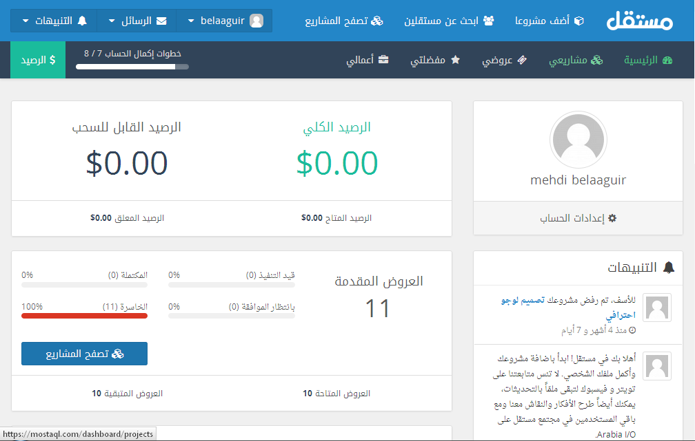 السلام عليكم ورحمة الله وتعالى وبركاته قبل ان آبدا اريد ان اقول لكم رمضان مبارك سعيد اليوم سوف نتحدث عن موقع مستقل هناك من سمع بهدا الموقع سوف اعطيك تعريف صغير عن الموقع " مستقل هو منصة تصل بين أصحاب المشاريع والمستقلين في العالم العربي. إن كنت صاحب مشاريع تستطيع استخدام مستقل لانجاز مشاريعك من خلال الانترنت بسهولة وأمان وتستطيع كمستقل تصفح المشاريع الموجودة وإضافة عروضك على المشاريع التي تستطيع إنجازها. يضمن مستقل حقوقك كاملة ويعمل كوسيط بين صاحب المشروع والمستقل. " ادا كانت عندك مشاريع في الانترنيت وتبحث عن مستقلين فان موقع مستقل يوفر لكل كل ما تحتاجه الموقع عبارة عن وسيط بين صاحب المشروع والمستقل والان ننتقل الى المرحلة التالية وهي طريقة التسجيل في موقع مستقل سوف تتوجه الى هدا الرابط mostaql.com الدي هو عبارة عن رابط التسجيل بعد الدخول تقوم بضغط على حساب جديد وسوف تظهر لك هده الصورة سوف تختار اي طريقة تريد التسجيل بها ما عبر الفيسبوك او تويتر انصحك اخي الكريم بتسجيل بطريقة العادية الانه يمكن ان يتم اغلاق حسابك في الفيسبوك او يتعرض لسرقة وهكدا تدهب كل امولك في الموقع تكتب اسم المستخدم والبريد الالكتروني يجب ان يكون صحيح الانه سوف يتم ارسل رسلة التفعيل اليه وتجنب عدم استخدام ايماي لات مزيفة الانه يؤدي الى حسابك للغلاق ويدهب مجهود سودا وسوف يطلب منك اختيار التسجيل بشخصية مستقل او صاحب مشاريع نحن سوف نتسجل بشخصية مستقل الاننا نريد ربح المال من الموقع . وبعد دلك الضغط على أوافق على شروط وتدهب الى الايم ايل وتجد رسلة التفعيل ومبروك عليك انت الان عضو في الموقع . كما تلاحظون هده هي الصفحة الرئيسية للموقع بعد التسجيل كما تلاحظ يمكن التعديل على الحساب الشخصي وعرض الاموال الخاصة بك في الموقع والرصيد القابل للسحب والعروض المتاحة يعني موقع سهل الاستعمال وفي قسم الرسائل يمكن التحدث معا اصحاب المشاريع وكل ماهو متعلق بالخدمة الان ننتقل الى طريقة الحصول على المشاريع او انجزها . بعد تسجيل وتصفح الموقع ننتقل الان لكيفية الربح من موقع مستقل نوجه الى قسم تصفح المشاريع سوف تجد العديد من المشاريع يمكن ان تختار المشروع الدي تريد والمناسب وثمن . كما تلاحظ في الصورة توجد العديد من المشاريع في مختلف المجالات التصميم البرمجة التدوين الطبخ كل شيئ يعني يمكن الاي شخص الربح من هدا الموقع فقط من منزله يجب ان تتوفر على حاسوب والانترنيت هناك قسم في العروض وهو يعرض لك عدد الاشخاص الدين قدموا الطلب للقيام بالمشروع كما تلاحظون وايضا يوجد قسم الميزانية هو عبارة عن المبلغ الدي سوف يدفع صاحب المشروع الى المستقل يعني مابين 50 - 100 دولار مثلا ويوجد مدة التنفيد وهو عدد الايام او الاشهر التي سوف تقوم به بالمشروع . تقوم بضغط على المشروع الدي تريد انجازه وتظهر لك صفحة على هدا الشكل يجب قراءة المشروع جيدا وتحديد الشيئ الدي يريد صاحب المشروع انجازه واختر مدة التسليم تكون قصيرة حتى قيمة العرض يكون مبلغ متوسط ولابأس به وتكتب العرض الدي سوف تقدمه لصاحب الموضوع ان يكون خالي من الخطأ ويكون تعبير مفهوم وكتابة جيدة حتى تضمن الحصول على العرض اما الخانة الخاصة مستحقاتك بعد الخصم الثمن الدي سوف تحصل عليه بعد خصم المبلغ بنسبة 15 % يعني الموقع سوف يأخد قدم من الارباح . وهكدا نصل الى نهاية الموضوع اتمنى ان يعجبك الدرس والموقع ايضا وكيف كانت التجربة معا موقع مستقل لاتنسى اخي الكريم تعليق تحفيزي للمزيد من الشروحات حول الربح رابط الموقع من هنا : مستقل