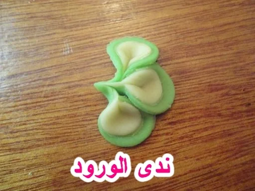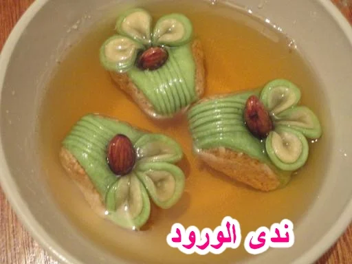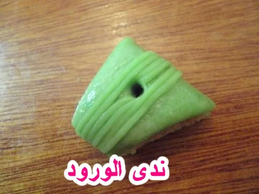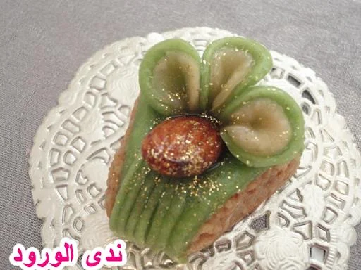 الــــــــــــمــــقادير: العجينة : 3 كيلات فرينة 3 /4 كاس مارغارين ذائبة – انا دائما استخدم هذا المكيال في جميع حلوياتي المعسلة - فانيليا - ماء زهر الحشو: 3 كيلات لوز مرحي كيلة سكر عادي 1 ملعقة صغيرة فانيليا 3 ملاعق كبيرة زبدة ذائبة للتزيين: حبات لوز صحيحة بقشورها تحضير العجينة : نخلطها ثم نعمل حفرة في الوسط ونفرغ المارغارين الذائبة ونخلط براحة اليدين حتى تمتزج الزبدة مع الفرينة نجمع العجينة بماء الزهر حتى الحصول على عجينة متماسكة نعجنها قليلا فقط ليس كثيرا مجرد تتماسك لكي تصبح ملساء نأخد جزء من العجينة البيضاء ونحتفظ به على حدى والعجينة المتبقية نضيف له ملون غذائي أخضر فسقي ( ملاحظة مهمة ) أنا هنا ااستخدمت ملون غذائي فستقي اللون لكن لم يعطيني النتيجة المرجوة العجينة اخدت اللون الاصفر المخضر الفاتح جدا لهذا لجأت لمزج الملون الازرق + الاصفر كي حصلت على لون فستقي جميل الموجود في الصورة ثم نقطعها الى قطع ونكورها ونغطيها بفيلم غذائي ونتركها ترتاح من جهة نحضر الحشو نخلط اللوز + السكر + الفانيليا + الزبدة الذائبة وبعدها نخفق 2 بيضات في صحن ونضيف البيض بالتدريج للحشو حتى يصبح حشو متماسك وغير طري طريقة التشكيل : على طاولة عمل مرشوشة بالفرينة نبسط العجينة بالحلال ونمررها في الماكينة في الرقم رقم 1 ، ثم في الرقم 3 ، ثم في الرقم 5 ، وأخيرا في الرقم 7 نقطع العجينة بشكل مستطيل كبير نضع الحشو على طرفي ![]() ونلفه لفتيين ثم نقطع ![]() ونلفه مرة ثانية بين يدينا لتضبيط الحربوش نبسط الحربوش قليلا من فوق بهذا الشكل ![]() ثم نقطع مثلثات بهذا الشكل ![]() ![]() نقطع خيوط من العجينة الخضراء في ماكينة العجينة بهذا الشكل ![]() نأخد مثلث ندهنه ببياض البيض بواسطة فرشاة ![]() نأخد خيط من العجينة الخضراء ونلفه بهذا الشكل حول المثلث بحيث نشكل 6 خطوط ![]() ونبسط العجينة الخضراء والعجينة البيضاء ونقطع بغطاءين بحجمين مختلفين بحيث يكون الابيض اصغر من الاخضر ![]() نضع الدائرة البيضاء على الدائرة الخضراء كما موضح في الصورة ![]() ونجمع طرفي كل دائرتين مع بعض بهذا الشكل ثم نجمع الثلات أشكال مع بعضها مثل الصورة ![]() نعمل ثقب بهذا الشكل ![]() بمساعدة عود أسنان نثبث الاشكال ونزين بحبة لوز صحيحة مثل الصورة ![]() نترك الحلوى ترتاح على الاقل 4 ساعات ثم نخبزها في فرن 160° لمدة 15 د إلى 20 دقيقة كحد أقصى فور خروج الحلوى من الفرن نضعها في عسل مخفف بماء الزهر ![]() نتركها فوق مصفاة لانزال الفائض من العسل ثم نرشها بجزيئات لماعة ذهبية اللون وتقدم في صحون ورقية ![]() الصور المصغرة للصور المرفقة