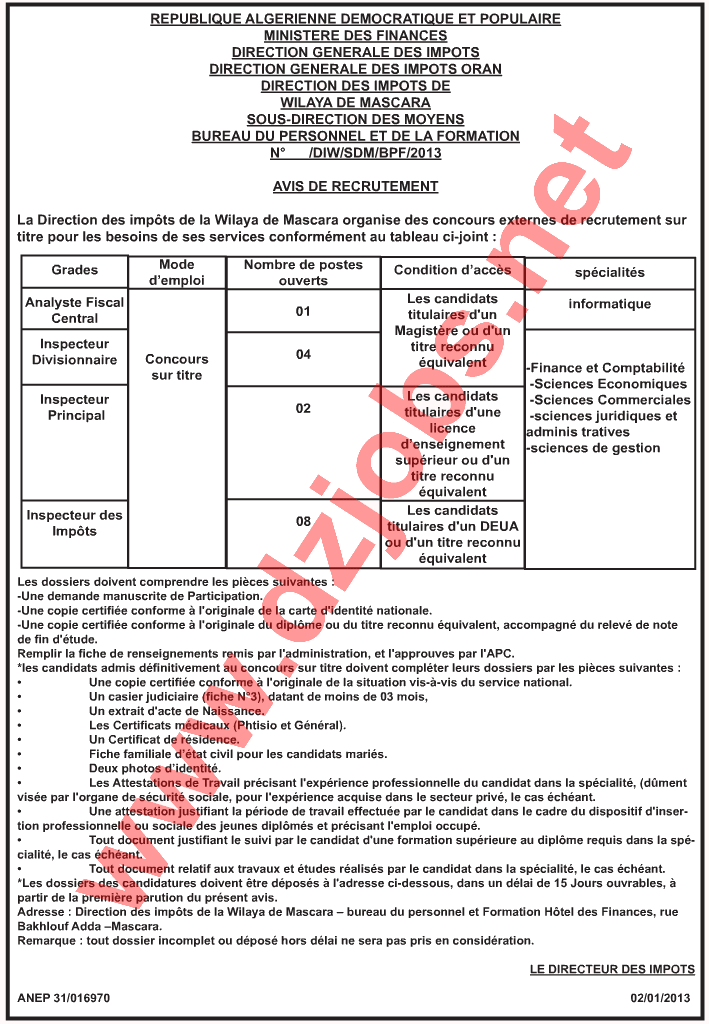 ۞ سيدي بلعباس + معســكر : توظيف 06 مفتش رئيسي للضرائب ۞