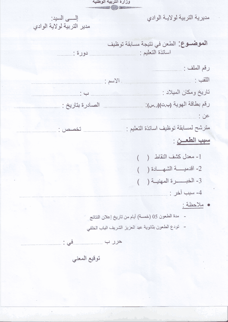 سيــد(ت)ي، بعد إطلاعي على النتائج الخاصة بالناجحين في مسابقة أساتذة التعليم ... ... ... 2014/2013 تخصص ... ... ... و كذا على السلم المعتمد و المعايير المطبقة طبقا للمنشور رقم 7 المؤرخ في 28 أفريل 2011 المتعلق بمعايير الإنتقاء في المسابقات على أساس الشهادة للتوظيف في رتب الوظيفة العمومية، يؤسفني أن أعلمكم أني غير راض تماما على قرار لجنتكم الموقرة و التي إعتبرتني » راسبا « رغم سنوات الخبرة التي أتمتع بها حوالي ... ... ... سنة في مجال التدريس و رغم أني متخرج منذ جوان ... ... ... ، لهدا أطلب من سيادتكم إعادة النظر في قرار لجنتكم الموقرة خصوصا و أن القائمة تضمنت أسماء ناجحين تخرجوا فقط جوان 2010 ، فهل يعقل أن يحدث هذا ؟