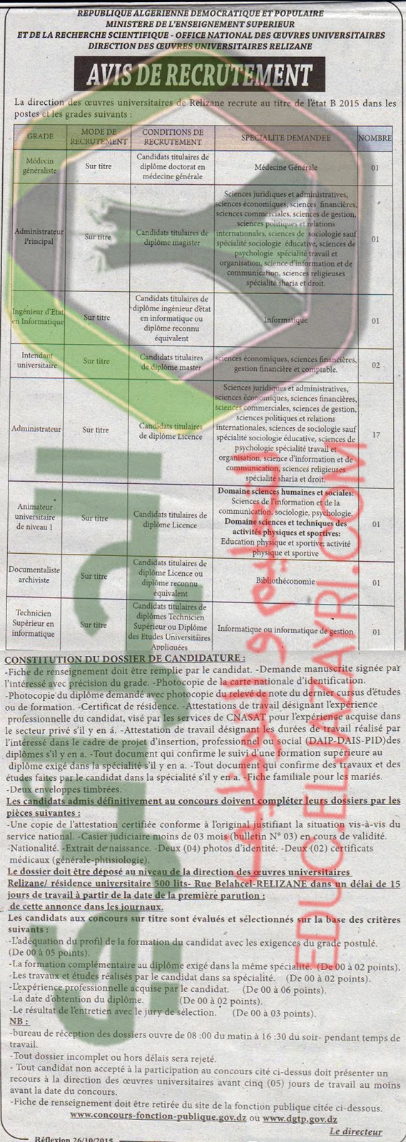 اعلان, اكتوبر2015, توظيف, جامعية, خدمات, غليزان