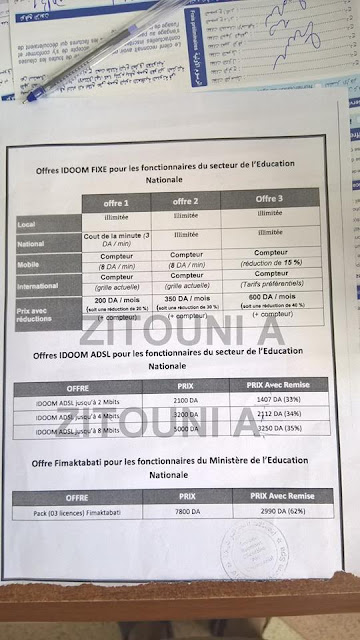 التسعيرة الجديدة للإشتراك بإنترنت ADSL الخاصة بموجب العقد المبرم بين وزارة التربية ووزارة البريد والإتصال
