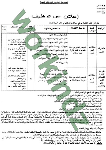 اعلان التوظيف بلديةالشقفة ولاية جيجل ديسمبر 2016