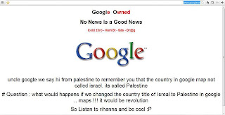 صورة - اختراق موقع 'جوجل' من قبل هاكرز مؤيدين للفلسطينيين ![]() وكتب "الهاكرز على واجهة جوجل لدقائق: "إلى العم جوجل، نقول لك مرحبا من فلسطين لنذكرك أن الدولة على خوارط جوجل لا تدعى "إسرائيل"، بل تدعى فلسطين. سؤال: ماذا لو غيرنا عنوان دولة "إسرائيل" إلى فلسطين في خوارط جوجل ؟؟ .. إنها ثورة". وفور فتح الموقع يمكنك مشاهدة ما كتبه الهاكرز إذا دخلت على موقع جوجل الفلسطيني