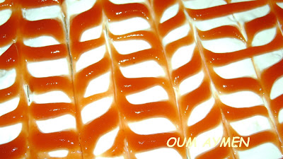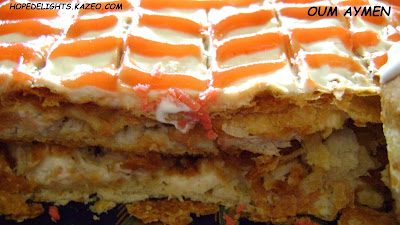 On a toujours l’habitude de faire un mille feuille sucré à la maison, cette fois si j’ai dit pourquoi pas un mille feuille salé…en changeant la crème pâtissière et le fondant aver une crème au fromage, en ajoutant du poulet hachée dans la farce et en décorant avec le ketchup « au lieu du chocolat ».