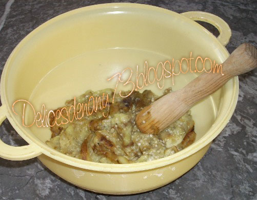 ثم ندق الباذنجان بمدقة الثوم أو بالشوكه ( لا نستعمل المطحنة الكهربائية أو اليدويه)