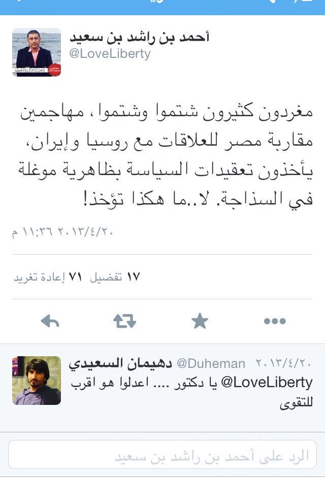 السيسي حيجنن الاخوان اليك تبريرات أحد منظري الاخوان في الخليج وهو برفيسور في الاعلام السياسي ايام حكم مرسي والاخوان لمصر يبرر فعلة مرسي وتأييده لروسيا بأزمة سوريا وتطبيعه مع ايران بعد قطيعة دامت 31 سنة واعادة السفير المصري الى سوريا ![]() |