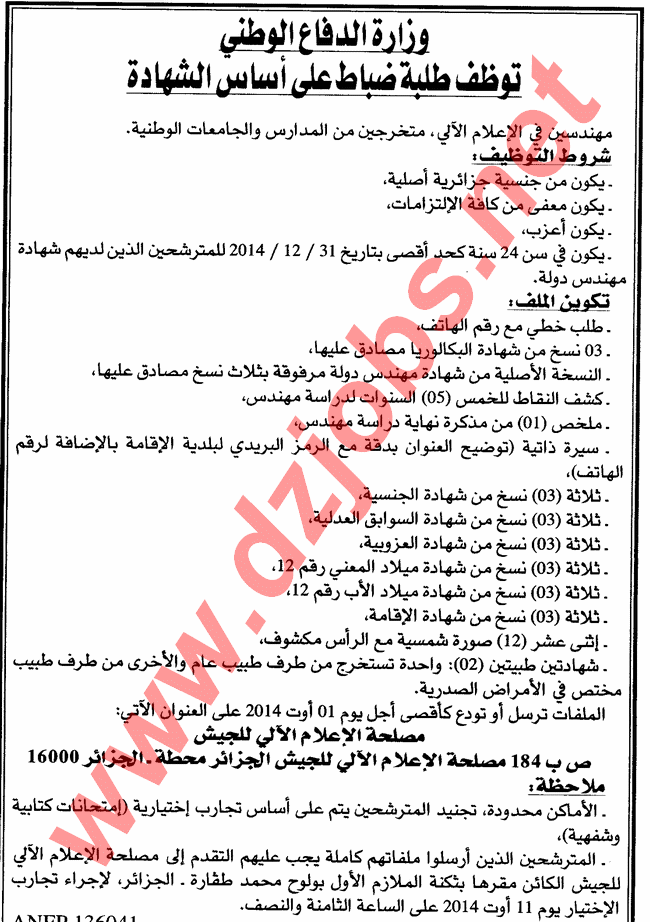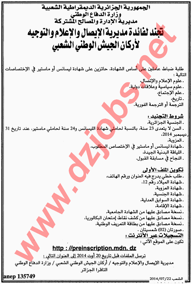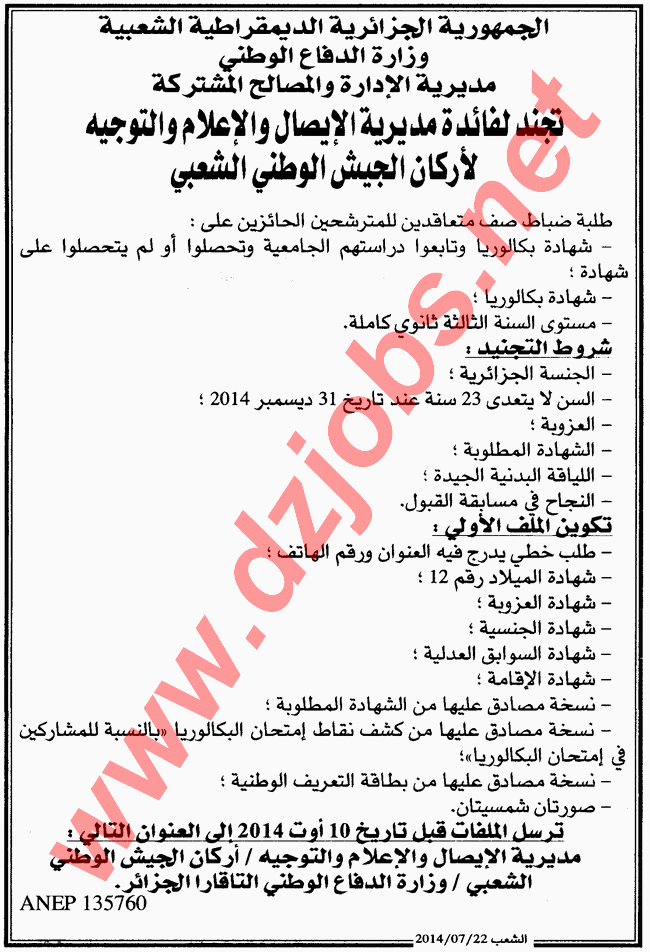 جديد الجيش الشعبي الوطني لتوظيف أصحاب الشهادات جويلية 2014