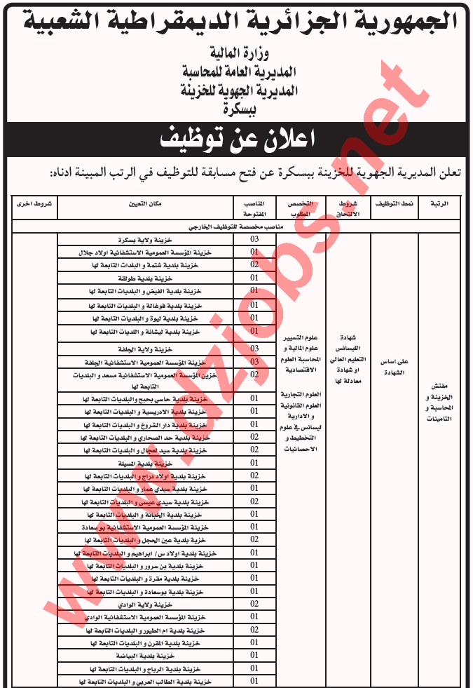 ( الجلفة + المسيلة + بسكرة + الوادي ) إعلان توظيف في المديرية الجهوية للخزينة جويلية 2014