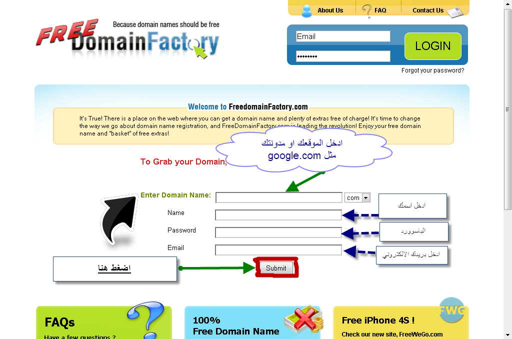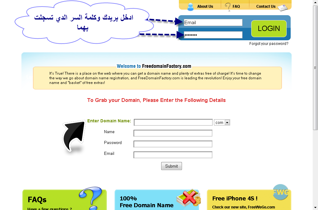 السلام عليكم ورحمة الله تعالى وبراكاته كل من لديه موقع او مدونة فانه يحلم ان يكون له دومين متل .com او .net او.org والعديد من النطاقات اليوم موقع th3prohere يجد طريقة لكي تحصل على نطاق مجاني لمدونتك او موقعك مع موقع free domain factory الشرح هدا هو رابط الموقع ادن عند الدخول الى الرابط اعلاه ستجد : ثم تم عند التسجيل تتوجه الى البريد الدي تسجلت به تم ستجد رسالة من الموقع تطلب منك ان تفعل حسابك عند تفعيل حسابك تقوم بادخال المعلومات التي تسجلت بها بقيت خطوت وحيدة للحصول على دومين مجاني دعوة اصدقاء برابطك الخاص