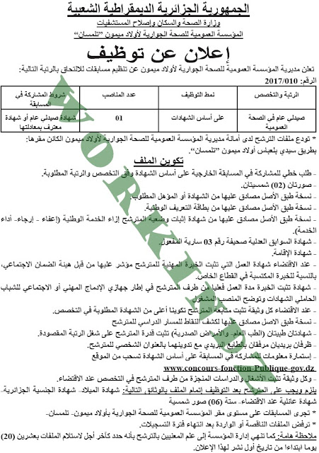 مسابقة علي أساس الشهادة مديرية المؤسسة العمومية للصحة الجوارية أولاد ميمون ولاية تلمسان