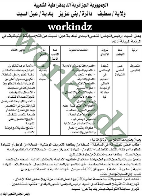 إعلان التوظيف بلدية عين السبت دائرة بني عزيز ولاية سطيف جانفي 2017
