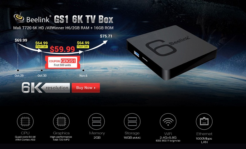 عرض وكوبون تخفيض رائع على جهاز TV BOX Beelink GS1
