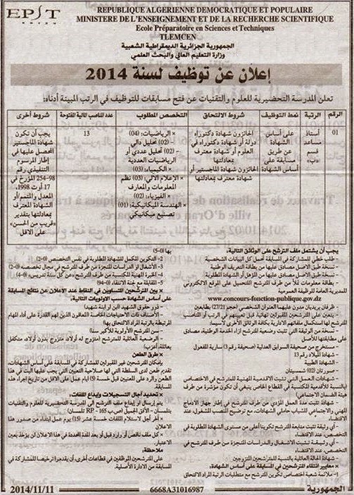 مسابقات توظيف الأساتذة المساعدين و الباحثين الدائمين 2014 - 2015