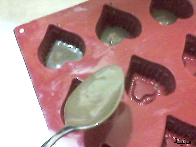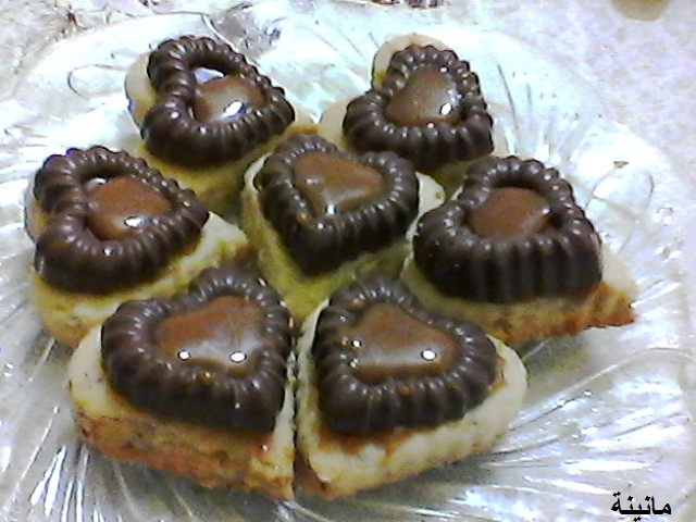 بسم الله والصلاة على رسول الله السلام عليكم صابلي بالشكولاطة مقاديرالعجينة : 1. حبة بيض 2. 150غ زبدة طرية 3. 1 ملعقة اكل زيت 4. 60غ سكررطب 5. قرصة خمارة 6. 50 غ بندق محمص ومطحون 7. فانيلا 8. قرصة ملح 9. 300 غ فرينة التزيين: 1. 300 غ شكولاطة بيضاء 2. 300 غ شكولاطة سوداء 3. 100غ كرامل 4. 100 غ جولي 5. حلوة تزيين طريقة التحضير: I. تحضير الشكولاطة : 1. ناخد الشكولاطة ونديبها على حمام مريم ثم نضعها في مول السلكون وندخله الثلاجة لتاخد الشكل. ll. تحضير الحلوة 1. تخلط جميع المكونات الزبدة والزيت +السكرخلط جيد + البندق +فانلا + ملح +البيضة + الفرينة مع الخمارة . 2. نترك العجينة ترتاح 20 د. 3. نحل العجينة بالحلال . 4. نقطعها على شكل قلوب . 5. ندخلها الفرن لتاخد اللون الذهبي . 6. بعد ماتبرد تماما . 7. نضع ملعقة صغيرة من الكرامل على كل واحدة . 8. نضع قطعة من الشكولاطة على الحلوة . 9. نملأ الفرغات اما بالكرامل او بالجولي . 10. نزينها بحلوة التزيين . |