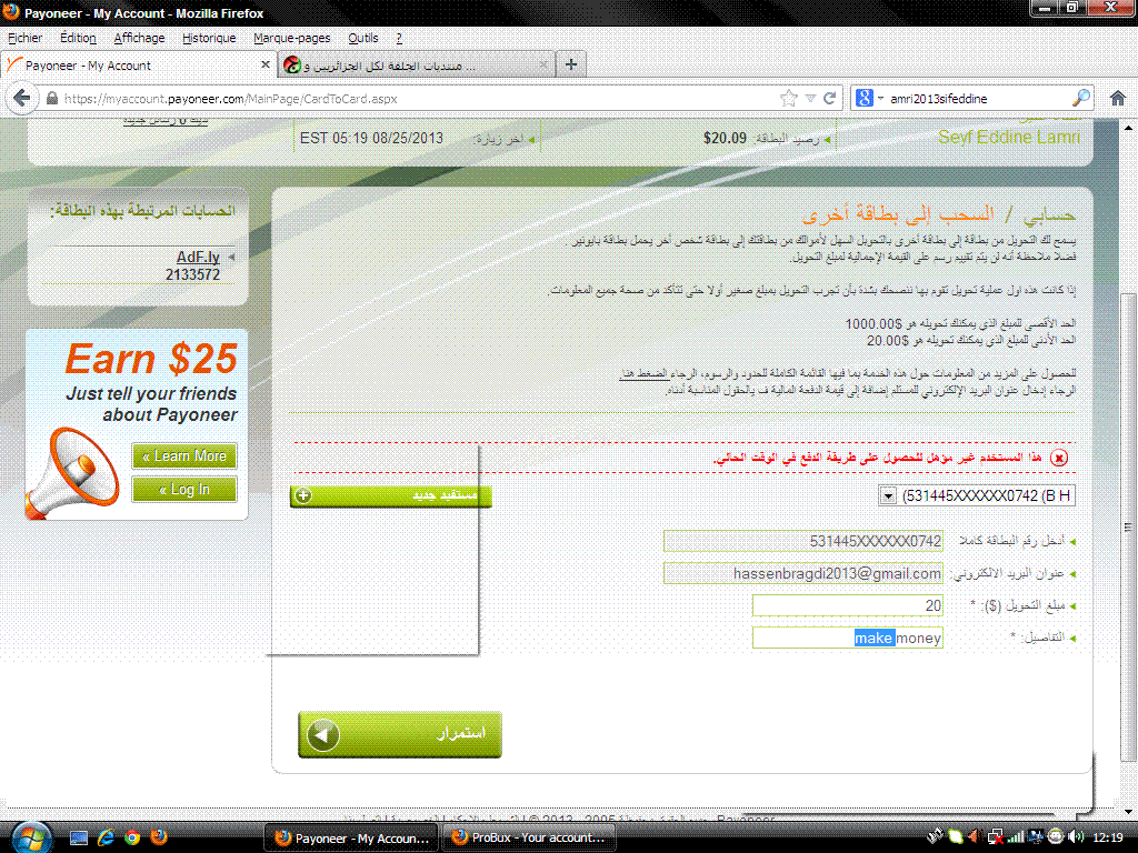 السلام عليك اخي فايز انا قمت بتفعيل البطاقة وربطها بالبايبال وسبق لي ان ارسلم اموال من البايبال إلى بطاقتي يعني كل شيء بالتمام المشكل الوحيد الذي لم افهمه هو انووووو هل استطيع سحب اموال من جوجل ادسنس إلى بايونر وكيف استطيع فعل ذلك ةكيف اراسل الدعم لاسجل في خدمة الدغع الامريكية يا ريت يكون شرح مصور |