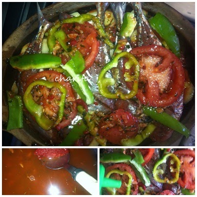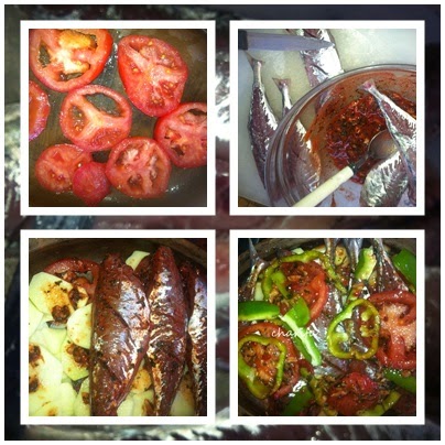 تقشر الطماطم وتقطع الى دوائر ترتب في الطاجين ونضيف البطاطس والسمك ثم يرتب فوقهم الفلفل الاخضر والطماطم المقطعين الى دوائر في الاخير نضيف الماء مع ملعقة من صلصة الطماطم الى التوابل المتبقية ( الشرميلة)ويسكب فوقالخضر والسمك