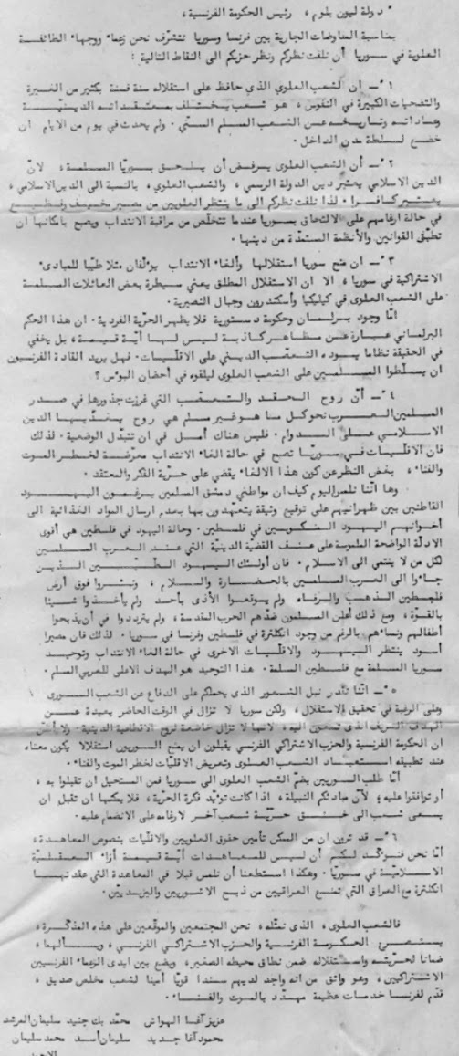 دولة ليون بلوم، رئيس الحكومة الفرنسية بمناسبة المفاوضات الجارية بين فرنسا وسوريا، نتشرّف، نحن الزعماء العلويين في سوريا أن نلفت نظركم ونظر حزبكم إلى النقاط الآتية: 1- إن الشعب العلوي الذي حافظ على استقلاله سنة فسنة، بكثير من الغيرة والتضحيات الكبيرة في النفوس، هو شعب يختلف بمعتقداته الدينية وعاداته وتاريخه عن الشعب المسلم السني. ولم يحدث في يوم من الأيام أن خضع لسلطة مدن الداخل. 2- إن الشعب العلوي يرفض أن يلحق بسوريا المسلمة، لأن الدين الإسلامي يعتبر دين الدولة الرسمي، والشعب العلوي، بالنسبة إلى الدين الإسلامي، يعتبر كافراً. لذا نلفت نظركم إلى ما ينتظر العلويين من مصير مخيف وفظيع في حالة إرغامهم على الالتحاق بسوريا عندما تتخلص من مراقبة الانتداب ويصبح في إمكانها أن تطبق القوانين والأنظمة المستمدة من دينها. 3- إن منح سوريا استقلالها وإلغاء الانتداب يؤلفان مثلا طيبا للمبادئ الاشتراكية في سوريا، إلا أن الاستقلال المطلق يعني سيطرة بعض العائلات المسلمة على الشعب العلوي في كيليكيا وإسكندرون (لواء الإسكندرون تم سلخه في 1939 عن سوريا وإلحاقة بتركيا) وجبال النصيرية. أما وجود برلمان وحكومة دستورية فلا يظهر الحرية الفردية. إن هذا الحكم البرلماني عبارة عن مظاهر كاذبة ليس لها قيمة، بل يخفي في الحقيقة نظاما يسوده التعصب الديني على الأقليات. فهل يريد القادة الفرنسيون أن يسلطوا المسلمين على الشعب العلوي ليلقوه في أحضان البؤس؟ 4- إن روح الحقد والتعصب التي غرزت جذورها في صدر المسلمين العرب نحو كل ما هو غير مسلم هي روح يغذيها الدين الإسلامي على الدوام. فليس هناك أمل في أن تتبدل الوضعية. لذلك فإن الأقليات في سوريا تصبح في حالة إلغاء الانتداب معرضة لخطر الموت والفناء، بغض النظر عن كون هذا الإلغاء يقضي على حرية الفكر والمعتقد. وها نلمس اليوم كيف أن مواطني دمشق المسلمين يرغمون اليهود القاطنين بين ظهرانيهم على توقيع وثيقة يتعهدون بها بعدم إرسال المواد الغذائية إلى إخوانهم اليهود المنكوبين في فلسطين. وحالة اليهود في فلسطين هي أقوى الأدلة الواضحة الملموسة على أهمية القضية الدينية التي عند العرب المسلمين لكل من لا ينتمي إلى الإسلام. فإن أولئك اليهود الطيبين الذين جاؤوا إلى العرب المسلمين بالحضارة والسلام، ونثروا فوق أرض فلسطين الذهب والرفاه ولم يوقعوا الأذى بأحد ولم يأخذوا شيئا بالقوة، ومع ذلك أعلن المسلمون ضدهم الحرب المقدسة، ولم يترددوا في أن يذبحوا أطفالهم ونساءهم بالرغم من أن وجود إنكلترا في فلسطين وفرنسا في سوريا. لذلك فإن مصيرا أسود ينتظر اليهود والأقليات الأخرى في حالة إلغاء الانتداب وتوحيد سوريا المسلمة مع فلسطين المسلمة. هذا التوحيد هو الهدف الأعلى للعربي المسلم. 5- إننا نقدر نبل الشعور الذي يحملكم على الدفاع عن الشعب السوري وعلى الرغبة في تحقيق الاستقلال، ولكن سوريا لا تزال في الوقت الحاضر بعيدة عن الهدف الشريف الذي تسعون إليه، لأنها لا تزال خاضعة لروح الاقطاعية الدينية. ولا نظن أن الحكومة الفرنسية والحزب الاشتراكي الفرنسي يقبلان بأن يمنح السوريون استقلالا يكون معناه عند تطبيقه استعباد الشعب العلوي وتعريض الأقليات لخطر الموت والفناء. أما طلب السوريين بضم الشعب العلوي إلى سوريا فمن المستحيل أن تقبلوا به، أو توافقوا عليه، لأن مبادئكم النبيلة، إذا كانت تؤيد فكرة الحرية، فلا يمكنها أن تقبل بأن يسعى شعب إلى خنق حرية شعب آخر لإرغامه على الانضمام إليه. 6- قد ترون أن من الممكن تأمين حقوق العلويين والأقليات بنصوص المعاهدة، أما نحن فنؤكد لكم أن ليس للمعاهدات أية قيمة إزاء العقلية الإسلامية في سوريا. وهكذا استطعنا أن نلمس قبلا في المعاهدة التي عقدتها إنكلترا مع العراق التي تمنع العراقيين من ذبح الآشوريين واليزيديين. فالشعب العلوي، الذي نمثله، نحن المتجمعين والموقعين على هذه المذكرة، يستصرخ الحكومة الفرنسية والحزب الاشتراكي الفرنسي ويسألهما، ضمانا لحريته واستقلاله ض