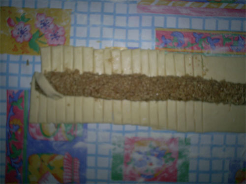 مقادير العجينة توضع بالفرن وتترك الا ان يصير لونها ذهبيوهي ساخنة يوضع عليها القطر او عسل ساخن وتترك لتتشرب قليلا3 مقادير دقيق1 مقدار نشاء مقدار غير كامل من زبدة ذائبة ( ثلاث أرباع لمقدارتقريبا ) ذرة ملح 3بيض ماء + ماء الزهر للعجن </STRONG></SPAN>ملاحظة:</STRONG></SPAN> </STRONG></SPAN></STRONG></SPAN></STRONG></SPAN></STRONG></SPAN> </STRONG></SPAN> بالشتاء يفضل ان يكون الماء دافئا الحشو مقادير لوز او اي مكسرات عندك ثلاث ارباع المقدار سكر قليل من القرفة تخلط المقادير جيدا ويضاف عليها قليلا من ماء الزهرالطريقة في وعاء تخلط كل مكونات العجين وتعجن جيدا الى ان نحصل على عجينة متماسكةتترك العجينة لمدة ساعة لترتاح قبل بداية العمل عليها نفرد قطعة العجينة على شكل مستطيل وتوضع الحشوة بالوسط ![]() ![]() تم نبدأ التظفير كما يلي </STRONG></SPAN> ![]() ![]() </STRONG> </SPAN> |
