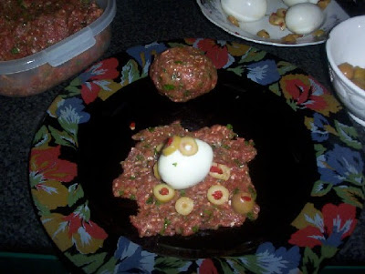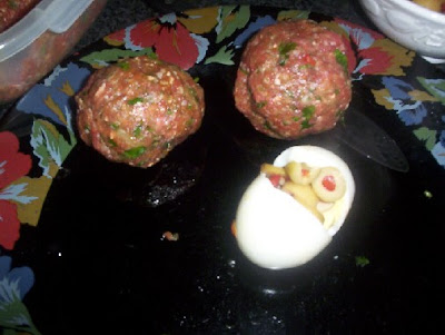 اللحم المفروم محشى بيض وزيتون ... بالخطوات المصورة ![]() المقادير... 500غرام لحم مفروم + 2 بصل مفروم + 5 بيض مسلوق + زيتون اخضر + بقدونس + زعفران + 2 ملعقةمعجون طماطم + بهار + ملح + زيت ذرة + كمون + بابريكا الطريقة ..... نمزج اللحم المفروم مع البهارات والملح ....ونتركه على الاقل ساعتين في الثلاجة ![]() نحشي الكفتة بالبيض كما هو مبين بالصورة بالبيض والزيتون ونشكلها على شكل كرات في صينية الفرن امزجي معجون الطماطم بكوب ماء ثم صفي فيها كرات اللحم وادخليها الفرن درجة حرارته 200لمدة ساعة .....او الى ان يستوي اللحم ... |