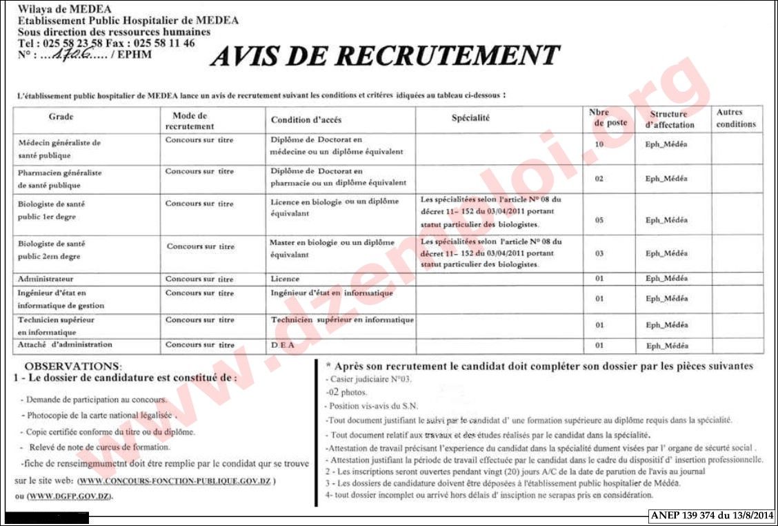 توظيف في المؤسسة العمومية الاستشفائية المدية أوت 2014 |