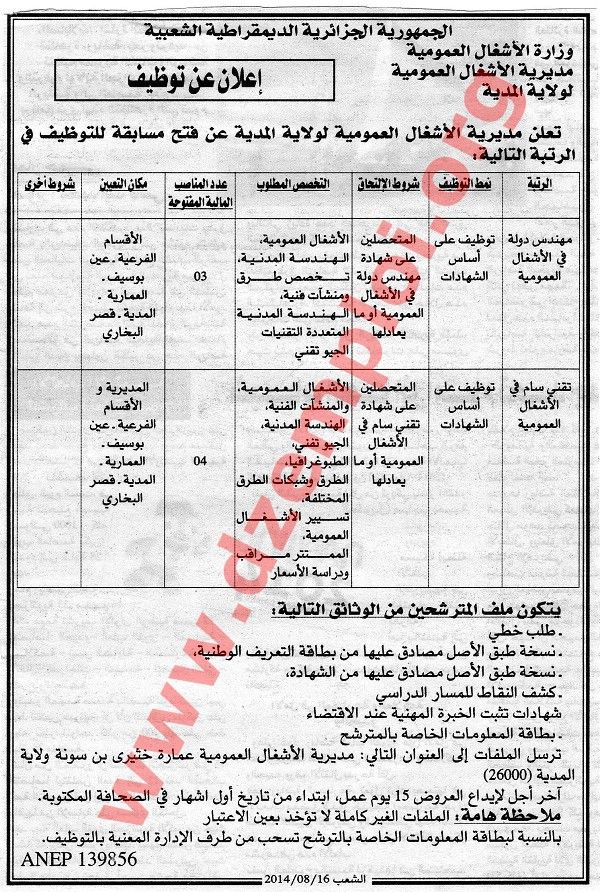 توظيف في مديرية الأشغال العمومية لولاية المدية أوت 2014 |