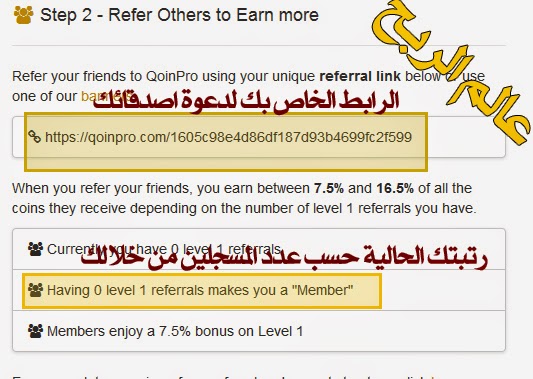 السلام عليكم ورحمة الله وبركاته اعزائي متابعي مدونة عالم الربح الكرام يسرني أن اقدم لكم اليوم شرح لموقع Qoinpro للحصول على Bitcoin و Litecoin والكثير من العملات الرقمية مجانا وبكل بساطة فهو لا يتطلب منك سوى التسجيل , لا تصفح إعلانات ولا غيرها وسيقوم بإضافة نقاط يومية لحسابك وعند وصول حسابك الحد الأدنى تستطيع سحبها إلى محفظتك الإلكترونية قبل أن نبدأ الشرح يجب أن يكون لديك حساب في موقع c-cex لتسجيل في موقع c-cex انقر هنا إ بعد الحصول على محفظتك الإلكترونية الخاصة إبدأ معنا في هذا الموضوع : أولا نتوجه للرابط التالي : إضـــغــط هــــنـــا أ شرح التسجيل في موقع qoinpro بعدها قم بالتسجيل كما في الصورة : ![]() بعد التسجيل ستصلك رسالة لبريدك فيها رابط لمواصلة التسجيل قم بمواصلة التسجيل وبعدها قم بتسجيل الدخول فتظهر لك كما في الصورة : ![]() طبعا الموقع يعطيك النقاط مجاناً ولكن نقاطك تزداد كلما دعوت شخص ليسجل عن طريقك فـ رابط الإحالة الخاص بك مهم جداً لزيادة نقاطك وفي هذه الصورة مستويات العضوية التي تحصل عليها حسب عدد الأشخاص الذين سجلوا عن طريقك ونسبة الزيادة في النقاط التي تحصل عليها ![]() اما لمعرفة رصيدك من النقاط حالياً فتوجه إلى Balances ومن ثم Coin balances كما في الصورة : ![]() [IMG]وهذه الصورة تظهر رصيدك من النقاط التي توصلت إليها[/IMG] ![]() ويمكنّك سحب نقاطك عن طريق الذهاب إلى Withdraw ولكن يجب ان تبلغ الحد الآدنى من النقاط , وستعرفه حسب نوع العملة فقط قم بالضغط على withdraw وهكذا نصل إلى نهاية الشرح رابط التسجيل مرة أخرى إضـــغــط هــــنـــا