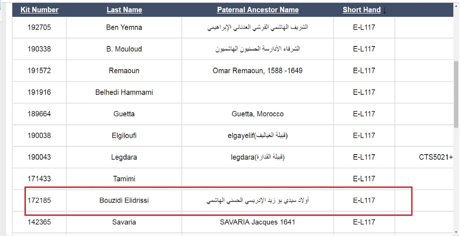 في الصور الثانية تسريب اخر لـ: نتائج فحص الحمض النووي الابوي (ذكور) من FTDNA الخاص بالاشراف الادارسة و الاسماعليين العلويين في المغرب و السعودية. وكلها تقع على الهابلوغروب الامازيغي