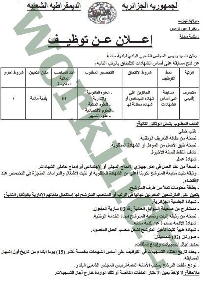 اعلان التوظيف بلدية مادنة ولاية تيارت ديسمبر 2016