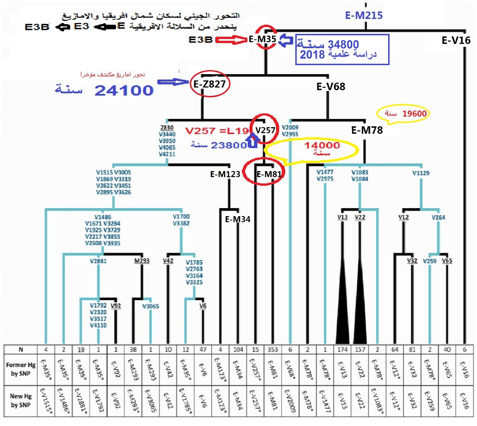 نقول وبحمد الله للكذابين قطاع طرق الجينيات والمدلسين الذين اصبحوا يمارسون التدليس دون حياء على اصول الشعوب والنتائج الدراسات الجينية التحور EM 81 لا يعتبر التحور الوحيد للامازيغ فلا احد من العلماء قال بهذا لماذا ؟ لان الامازيغ ليسوا شعب ينتمي الى شخص معين معرف في الترايخ كما هو الحال بالنسبة للعرب العدنانيين فهم ينتسبون الى عدنان الى اسماعيل عليه السلام ابن ابراهيم وكما ينتمي الاسرائليين الى يعقوب وهو اسرائل ابن اسحاق ابن ابراهيم عليهم الصلاة والسلام فهؤلاء هم الشعبين الوحيدين في العالم ينسبان انفسهم الى شخصية معلومة وحصروا انفسهم وقوميتهم في شخصين اسماعيل واسرائيل بينما الامازيغ هم جينيا ينحدرون من التحور EM35 وهو التحور الاب لكل الامازيغ في التحورات التحتية للسلالة EM35 يوجد التحور EM81 والتحور EM78 وتحورات تحتية اخرى وللعلم التحور EM78 هو تحور اخ للتحور EM81 وكلاهما ينحدرون من اب واحد هو التحورالاعلى EM35 انظر الصورة في الاسفل توضح تفرعات السلالة الافريقية EM35 وعلاقة التحور ( E-M78 ) مع التحور الامازيغي الاخر ( E-M81 ) وكلاهما ابناء التحور الامازيغي الشمال افريقي ( E-M35 ) انظر توضيح للشجرة الجينية للسلالة الامازيغية ( E-M35 ) واعمار تحوراتها التحتية: ![]() تجدون هذه التحديثات مسجلة ايضا على الرابط التالي: https://academic.oup.com/view-large/...evv118f2p.jpeg صورة لتفرعات السلالة EM35 حسب دراسة (TROMBETTA) سنة 2015: لا حظوا جيدا ان السلالة EM78 و EM81 وكلاهما تحوران موجودان لدى الامازيغ في المغرب الكبير فهم ابناء عمومة وينحدرون من اب او شعب واحد يحمل السلالة EM35 ونعلم جيدا أن دراسة Trombetta et al 2015 قد حسمت بشأن السلالة E-Z827 و ابنتها السلالة EV257 التي تعتبر شمال افريقية امازيغية مئة بالمئة حيث يبين اللون البنفسجي في الشجرة ان EZ827 و التحور EM78 هما شمال افريقيان بنسبة عالية : ![]() تجدون هذه المخططات والدراسة لفريق (بنيامين طرامبيطا لسنة 2015) على الرابط التالي: https://academic.oup.com/gbe/article...31621#74347453 استنتاج مهم : اذن السلالة EM 78 من خلال الشجرة الجينية هي اخت كبرى للتحور الامازيغي الاخر وهو EM81 وهم ينحدرون كلاهما من شعب او اب واحد يحمل التحور EM35 سكن شمال افريقيا في عصور غابرة وينحدر منه الامازيغ بمختلف تحوراتهم التحتية للسلالة EM35 ربما يسؤل بعضكم لماذا اكتشف التحور EM78 في رفاة تافوغلت التي عمرها اكثر من 15 الف سنة ولم يكتشف التحور M81 الجواب بسيط للغاية كما سبق اثباته التحور EM81 لا يتعدى 14 الف سنة على الاكثر فكيف يبحث عنه في زمن اعلى من 14 الف سنة بينما التحور EM78 عمره اكبر من التحور EM81 عمر التحور E-M78 الشمال افريقي هو 19800 سنة من الحاضر فبطبيعة الحال ان يكتشف في رفاة عمرها اكثر من 15 الف سنة هذا النوع من التحور وهو ايضا يعتبر احد التحورات الامازيغية انظر موقع شركة الالمانية للدراسات الجينية ياكد عمر التحور EM78 : https://www.yfull.com/tree/E-M78/ ![]() انظر اخي القارئ داخل تلك الشجرة الجينية للتتاكد ان E-M78 الذي عمره هو 19800 سنة و هو ينحدر من السلالة الافريقية E-M35 كما ينحدر التحور EM81 الذي عمره 14 الف سنة من نفس السلالة EM35 يعني انهم اخوة وابناء عم وينتمون الى اسلاف واحدة سكنت شمال افريقيا وخاصة المغرب الامازيغي الكبير استنتاج مهم : فكل حامل للتحور EM81 هو حامل للتحور EM35 وللتحور الاعلى منه EM215 وكل حامل ا للتحور EM78 هو ايضا حامل للتحور EM35 و للتحور الاعلى منه EM215 يستنتج من ذلك ان اسلاف الامازيغ اصحاب التحور EM81 واصحاب التحور EM78 ومن خلال اكتشاف جينات انسان تافوغلت التي عمرها اكثر من 15 الف سنة والتي تحمل التحور EM78 .و ايضا التحور الاعلى لهم EM215 ان هذه الاخيرة ( EM215) هي تعتبر اسلاف قدامى ايضا للامازيغ من اصحاب التحور EM81 مما يعني ان اجداد الامازيغ كانوا موجودون فوق ارض المغرب الامازيغي الكبير منذ اكثر من 15 الف سنة هذه هي القراءة الصحيحة لنتائج اكتشاف جينات انسان تافوغالت والتي تاكد تواجد اجداد الامازيغ وهم السلالة EM35 و EM215 من الاف السنين في المغرب الامازيغي الكبير و هو الامر المثبة علميا وبالادلة 