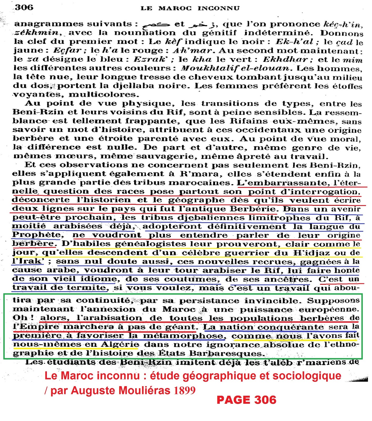 زيادة على ادعاء العروبين القوميين والبعثيين عروبة الامازيغ وعلى انتساب الزائف لبعض الامازيغ الى انساب عربية وهمية جاء الأوروبيون حديثاً،واحتلوا بلدان المغرب الإسلامي فزادوا البحث في الأصول والأعراق تشعٌباً، واضطراباً، سِيَّما المُغرضين منهم، أولئك الذين لم يكونوا يبحثون عن الحقيقة لذاتها، وإنما كانوا يَرمون إلى تشكيك المستضعَفين في أنسابهم، ومحوْ الاعتزاز بالآباء، والأجداد من نفوسهم، إخماداً لجِذوةِ حِميتِهم، وحَماستهم،وترويضهم على الاستكانة، والهوان من اجل احتلال أرضهم إلى الأبد. هناك مصدر فرنسي صريح يؤكد عملية التعريب التي انتهجتها فرنسا بالمغرب و الجزائر و ايضا تزوير الاصول لاجتثاثهم من أصولهم و فك رابطهم بأرض أجدادهم: جاء هذا في كتاب (اوغيست موليراس سنة 1899) وهو باحث جغرافي لدى المحتل الفرنسي : Le Maroc inconnu : étude géographique et sociologique/ par Auguste Mouliéras 1899 يقول هذا المؤرخ : جزء من الجباليين تعربوا و صاروا لا يحبون التكلم علي اصولهم الامازيغية،النسابين زوروا لهم اصولهم ....و صاروا يتحدثون علي اصولهم الحجازية او من احد الفرسان العرب....هناك متطوعين يريدون ايضا تعريب الريف ...الامبراطورية الفرنسية سوف تساعدهم لانجاح هذا المشروع لاخظاعهم كما فعلنا قبلا بالجزائر...وسيكون تعريب الامازيغ خطوة كبيرة للامبراطورية الفرنسية اقرا كتاب : aguste moulieras le Maroc inconnue 2 eme partie exploration de djebala Edition 1899 page 306 لقراءة الصفحة ادخل الرابط التالي: https://gallica.bnf.fr/ark:/12148/bpt6k83137z/f317.item وهذه صورة للمقال: https://1.bp.blogspot.com/-_X6E-Mdmo...%25B5%2B12.jpg ![]() ملاحظة : لدينا مراجع احصائية لسنة 1876م عن كل الاعراش الجزائرية وعدد كل افرادهم وعدد خيامهم وعدد اغنامهم وابلهم وكل شيء عنهم في الوقت المناسب سنضع موضوع للتعرف على كل الاعراش الجزائرية والاحصاءات المتعلقة بها مع المراجع للعلم ان بعض الاعراش التي تنسب الى العرب الهلاليين في الجزائر عدد افرادها لا يتعدى الف فرد ومنها قبيلة رحمان الغرابة ورحمان الشراقة |