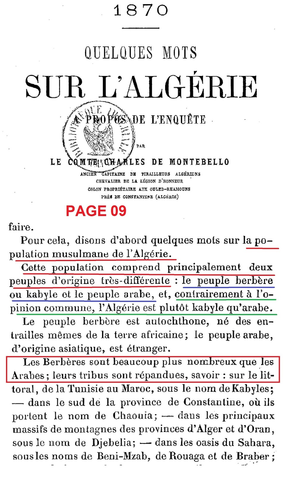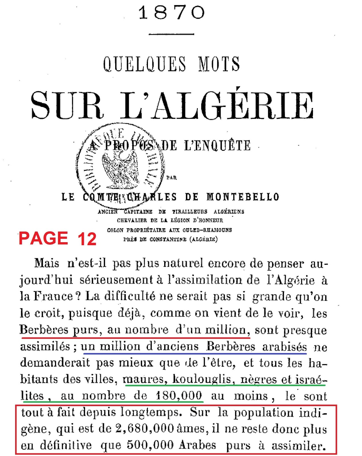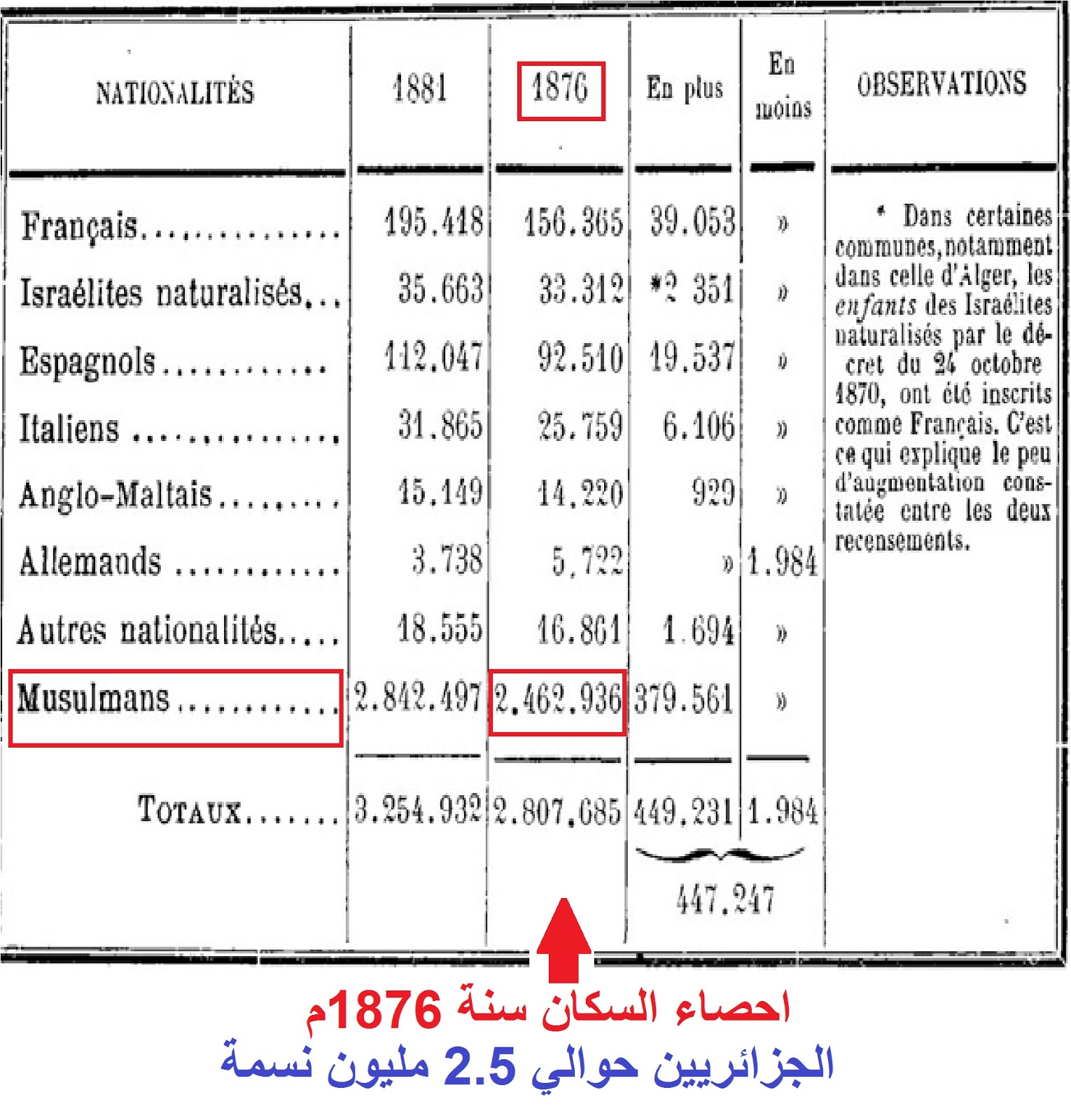 اولا علينا ان نعرف عدد الجزائريين عامة حسب احصاء 1876م رغم انها لم تكن شاملة ودقيقة ولم تتمكن من دخول اعماق القرى في الجبال كمنطقة الاوراس و منطقة القبايل الكبرى الا انه تم تسجيل هو حوالي 2.5 مليون نسمة من الجزائريين في هذا السنة المرجع : https://algeroisementvotre.free.fr/si.../demo0001.html انظر احصاء 1876 في الصورة التالية : ![]() كم كان عدد هؤلاء الامازيغ حسب التقديرات الباحثين الفرنسيين في ذلك الوقت ؟ الجواب : نجده في تقارير القبطان (كونت شارل مونتبيلو لسنة 1870) (le captaine le conte charle de montbello ) يقول كونت شارل مونتبيلو في بعض تقاريره وهو اهد اهم العسكريين الفرنسيين المهتمين والمكلفين بوضع استراتيجية اجتماعية لتسهيل الاستيطان والاحتلال الدائم للجزائر : يقول : ان الامازيغ اكثر بكثير من العرب في الجزائر ![]() ويقول ايضا القبطان (شارل مونتبيلو) انه من بين 2.5 مليون جزائري قدر عدد الامازيغ الناطقين بالامازيغية يوجد حوالي اكثر من مليون نسمة متكلمين بالامازيغية ومليون اخر من الامازيغ المستعربين اي ان هناك اكثر من 2 مليون من الامازيغ حسب الاحصاءات الفرنسية سنة 1876م وياكد ايضا (شارل مونتبيلو) ان العرب الحقيقيين لا يتجاوزون عددهم 500 الف نسمة على الاكثر. ومن جهة اخرى الباحث الفرنسي (شارل مونتبيلوا) ياكد في تقاريره على ظاهرة استعراب الكثير من الامازيغ لاسباب دينية و اجتماعية وفي نفس الوقت يسجل على انهم امازيغ الاصل رغم استعرابهم وقدر عددهم بمليون امازيغي مستعرب ![]() نعم اخي القارئ لم يعد لبقايا الاعراب في الجزائر في العهد الفرنسي اي ثقل عددي بعدما تعرضوا لسنوات لحروب قاسية من الامازيغ و بسبب تعرضهم في عدة مراحل زمنية الى كوارث طبيعية خطيرة ومنها مرض الطاعون في القرن 18 م و القرن 16 و 13 ميلادي حيث كاد هذا المرض ان يفني البشرية جمعاء مع العلم ان الجزائر كان تعداد سكانها في اواخر العهد العثماني حوالي 10 مليون نسمة وبسبب ظروف الاحتلال الفرنسي و الاوبئة و الفقر تقلصت اعداد الجزائريين كما بينته الاحصاءات السابقة ومن خلال تلك الاحصاءات التي قدرت ان العرب الحقيقييين لا يتجاوزون سنة 1876 م 500 الف فرد كاقصى تقدير وكمثال عن اعددا افراد اكبر عرش او قبيلة عربية تنتمي الى بني هلال نذكر لكم (قبيلة رحمان الرياحية الهلالية) حيث لم يتعدى عدد افرادها 5 الاف فرد حسب احصاء 1879م كود PHP: