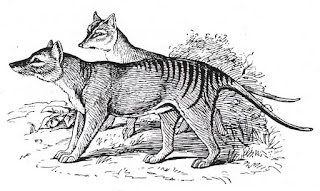 الثيلسين ويسمى أيضاً بنمر تسمانيا أو ذئب تسمانيا، ينتمي لأستراليا ولغينيا ولتسمانيا، انقرضت الثيلسين في القرن الـ 20 ![]() الوصف : الثيلسين ذو حجم كبير وهو مخلوق ذو شعر قصير وذيل يشبه ذيل الكلب ينسدل الذيل من الجسم كما في الكنغر، وقد شبهه الكثير من المواطنين قديماً بالضباع وذلك لسلوكه الغير طبيعي، تميز الثيلسين بالخطوط السوداء المميزة على الظهر والجزء الخلفي من الجسم وعلى الذيل ولهذا أطلق عليه لقب "الببر" يبلغ عدد تلك الخطوط حوالي 21-23 خط وتبدوا تلك الخطوط أكثر وضوحاً في الثيلسين حديثي الولادة والصغار حيث تتلاشى تلك الخطوط مع التقدم في السن . يتراوح طول الثيلسين البالغ بين 100-130 سم بالإضافة لذيله بطول 50-65 سم، كانت أكبر عينة بطول 290 سم من الأنف حتى نهاية الذيل، يصل إرتفاع الثيلسين البالغ لـ 60 سم ويتراوح وزنه بين 20-30 كجم، كان هناك إختلاف بسيط في الحجم بين الجنسين حيث الذكر أكبر من الإنثى كان الثيلسين لديه المقدرة على فتح فمه بشكل غير طبيعي حيث يستطيع فتح فمه حتى 120 درجة ويمكن ملاحظة ذلك في فلم ديفيد فلي القصير الذي يعود لـ 1993 والذي يصور فيها ثيلسين في الأسر، كانت تلك الفكوك متصلة بعضلات ولكنها ضعيفة وعلى تلك الفكوك هناك 46 سناً كانت طبعات أقدام الثيلسين مميزة عن بقية المخلوقات حيث كانت ذات راحة كف كبيرة جداً وبها أربعة مخالب متجهة للأمام مباشرةً، كانت الكفوف الخلفية مماثلة للأمامية ولكن بدلاً من أربعة مخالب فهناك خمسة مخالب كانت، كل تلك المخالب مخالب غير قابلة للسحب النظام الغذائي : كان الثيلسين حيوان لاحم وكانت عضلات المعدة لديه تملك القدرة على التمدد لتسمح للثيلسين بأن يأكل كميات كبيرة من الطعام في جلسة واحدة وقد كان هذا تكيفاً مع الشح والأوقات الطويلة التي تمر دون أن يصطاد فيها، لا يُعرف سوى القليل عن غذاء الثيلسين ويعتقد أن فريسة الثيلسين كانت تشمل الـ "الكنغر ، الولب ، الطيور ، الومب ، الباتوروس ، البوسوم" وأظهرت دراسة أجريت في جامعة نيو ساوث ويلز في 2011 مستخدمةً الكمبيوترات المتطورة لوضع نماذج وتحليلها أن الثيلسين ذو فكين ضعيفين جداً ولهذا فهو يختار الفرائس الصغيرة حيث أن ثيلسين بالغ بوزن 30 كجم يختار فريسة بوزن أكبر من 5 كجم ويعتقد الباحثون أن الثيلسين أقتصر غذائها على المخلوقات الصغيرة فقط مما يجعلها تتنافس مع الشيطان التسماني ونمر كوال