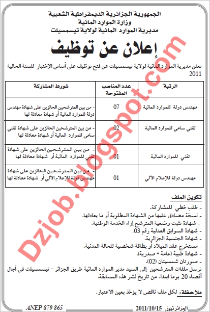 اخي انظر موقع الوظيف العمومي ستجد كل شئ مثلا هناك اعلان عن توضيف في مدريات الري سكيكدة تسمسيلت ![]() البويرة ![]() بالتوفيق |