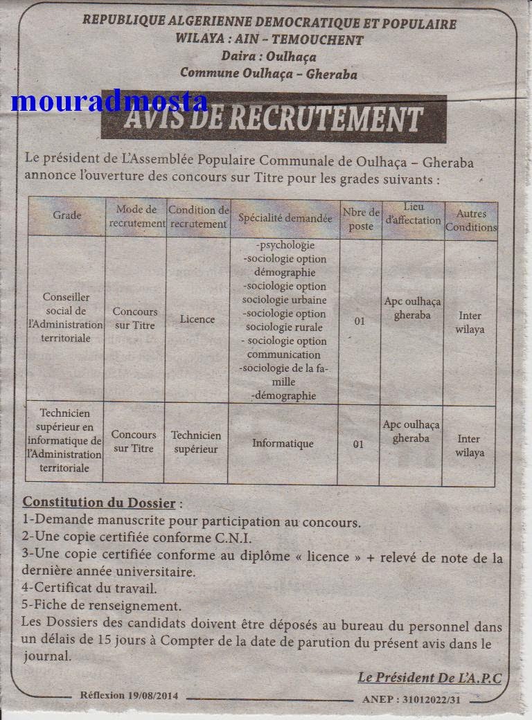 من عندي ومن عندك تنطبع و من عندي وحدي تنقطع كما أشرت في المشاركة الأولى للموضوع فإن الفكرة تستدعي تظافر الجهود و التحلي بالمسؤولية و أن فردا واحدا لايمكنه فعل ذلك وعليه سأتقيد بالولايات التي تعهدت بها فقط الإعلانات موقوفة بتاريخ 2014/08/20 لفتح الملفات يتوجب أن يكون لديك البرنامجين التاليين winrar لفك الضغط عن الملفات إضغط على الصورة لتحميله adobe reader لقراءة الملفات الالكترونية إضغط على الصورة لتحميله ![]() 1531 مسابقة توظيف ولاية باتنة(33) ولاية بجاية(26) جديد ولاية سيدي بلعباس (16) ولاية المسيلة(01) ولاية ورقلة(62) ولاية وهران(37) جديد ولاية البيض(12) ولاية عين تموشنت(65) بالتوفيق للجميع ![]() |