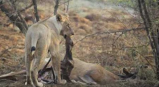 أسد ينهش غزاله ويموت بجوارها بعد ان إكتشف إنها حامل.