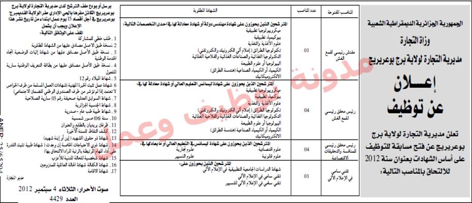 اعلان توظيف بمديرية املاك الدولة لولاية ادرار سبتمبر 2012