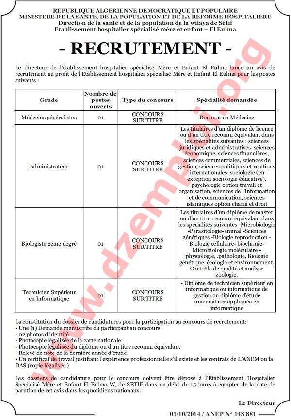 إعلان مسابقة توظيف في المؤسسة الاستشفائية المتخصصة الأم والطفل العلمة ولاية سطيف أكتوبر 2014 آخر تعديل Dj BoBo 2014-10-09 في 13:14.