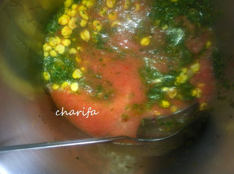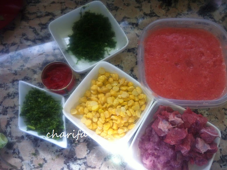 ![]() الحريرة المغربية 200غ من اللحم البقري مقطع مربعات 200غ من الحمص المنقوع في الماء ليلة كاملة ثم يزال له القشر بصلة متوسطة مبشورة او مطحونة نصف كيلو من الطماطم مطحونة +ملعقتين كبيرتين من صلصة الطماطم المعلبة 4ملاعق من المقدونس المعدنوس +4معالق منالقزبور مقطعين 150الى 200غ من الكرافس مقطع ملعقة صغيرة من الفلفل الاسود +نصف ملعقة من الزنجبيل والكركم والقرفة وقليل من الملون الغدائي +عود من القرفة ملعقة صغيرة من السمن الحار +قليل من زيت الزيتون مقدار اربع ملاعق كبيرة لترين من الماء +نصف عصير ليمونة +البيض+5ملاعق من النشا يمكن استبداله بالدقيق الطريقة في طنجرة الظغط على النار نضيف الزيت مع اللحم والبصل والتوابل مع قليل من الماء لكي لاتحترق التوابل نترك الكل يتقلى ثم نضيف تدريجيا الحمص والمعدنوس والقزبور والكرافس -الطماطم المطحونة والمصبرة +السمن الحار+عود القرفة نضيف الماء المغلي ونغطي الطنجرة ونترك الكل ينضج حوالي 30دقيقة ثم يمزج النشا او الدقيق مع الماء ويصفى من الحبيبات يسكب المزيج فوق الحريرة مع التحريك حتى لاتتكون كتل ..يمكن اضافة الماء حسب دوق كل واحد في سمك الحريرة يضاف 3ملاعق كبيرة من الشعرية الرقيقة نتركها تنضج مدة 10دقايق ثم نضيف البيض فوق الحساء مع التحريك عند التقديم يضاف قليل من القزبور والكرافس المقطع مع عصير نصف ليمونة